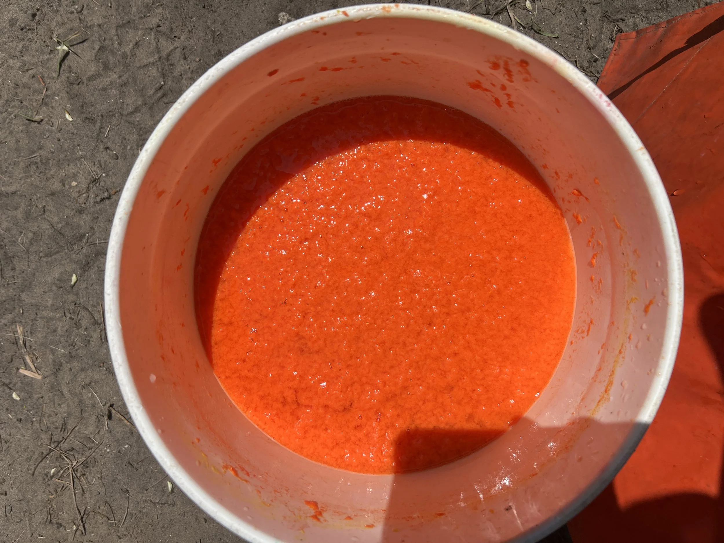 Fiber is maserated, Beat to a Pulp using a Reina brand Hollander beater. Water is partially strained from the Fiber, so that the Fiber can be condensed into a plastic 5-gallon bucket.